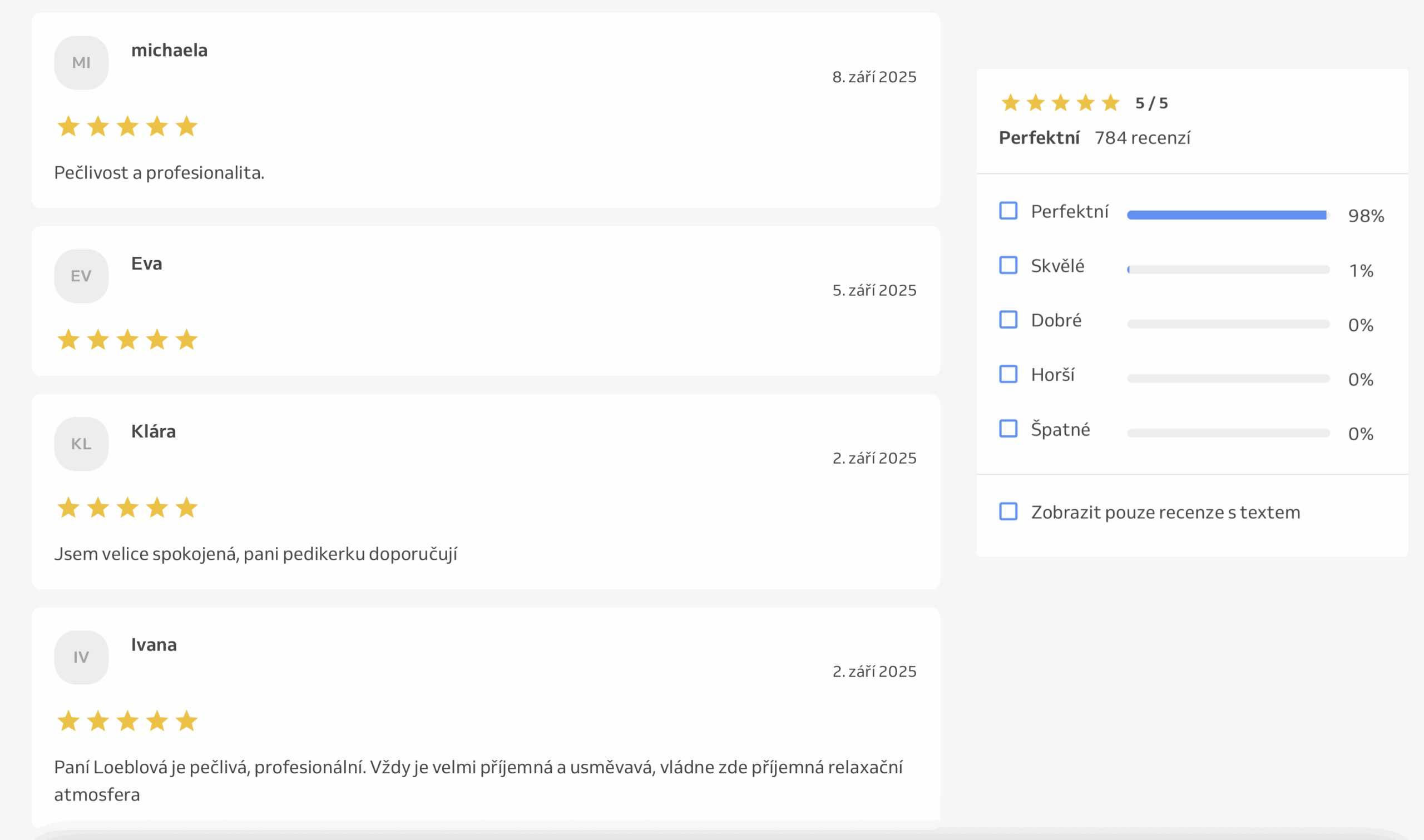 Díky 30 letům zkušeností a zdravotnickému vzdělání dokážu přesně identifikovat vaše problémy a nabídnout vám nejlepší řešení. Ať už řešíte zarostlé nehty, kuří oka na malíkovém kloubu, nebo popraskané paty - vaše nohy budou v těch nejlepších rukou.